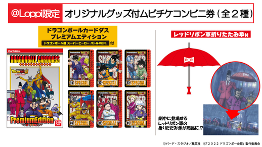 Get either a "Dragon Ball Carddass Premium Edition - Dragon Ball Super: SUPER HERO Battle Version" card set or a Red Ribbon Army Folding Umbrella with your movie tickets!