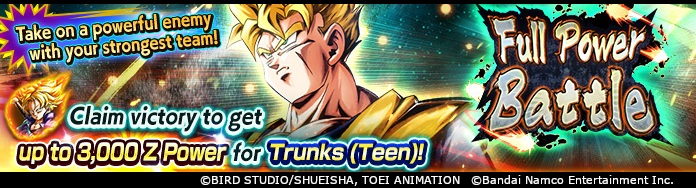 Full Power Battle is a mode where you and 3 buddy characters take on a boss in a super challenging 4-on-1 battle! Complete all 3 stages in the event to get 3,000 Z Power for Super Saiyan Trunks (Teen) (DBL-EVT-46S)!