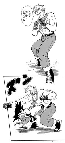 He's a tall and muscular man with amazing strength and speed. He was actually fast enough to briefly snatch Goku's bag of Dragon Balls and was even so confident he boasted that he could end Goku's life in five seconds. However, when attempting to do so, he wound up getting easily knocked out by his opponent.