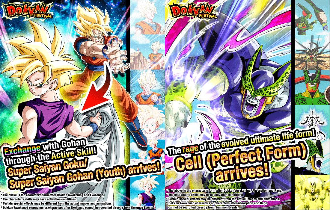 *The characters pictured above are the Dokkan Awakened versions of the characters who are obtainable from their respective summons, [Tense Battlefield] Super Saiyan Goku and [Monster Created by a Computer] Cell (1st Form).