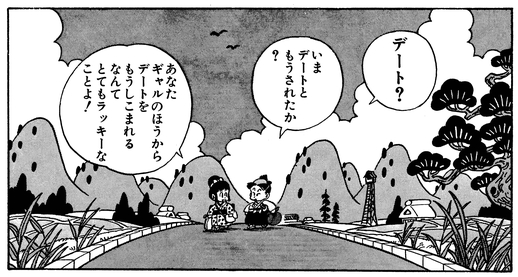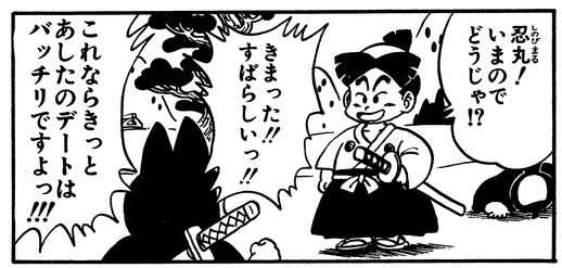 Upon arriving home, Ken'nosuke calls upon Shinobimaru, a pig-like ninja, to tell him exactly what a date is.