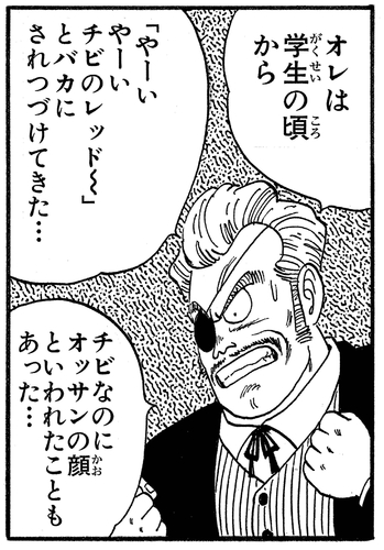Commander Red had been teased about his short stature from a young age, causing him to develop a complex over it, obsessively believing that "a conqueror has to be charismatic... dominating... impressive..."