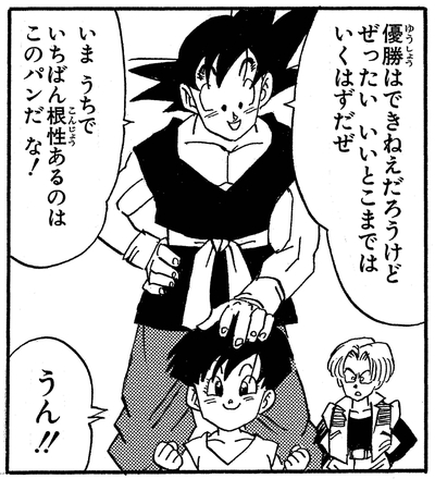 Pan enters the Tenkaichi Budokai alongside all the other adults at the tender age of 4 and faces the powerful-looking Mo Kekko, who was the runner-up at the previous tournament.
