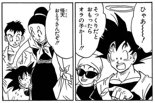 Since Goku lost his life in the Cell Games and spent his time in the other world, Goten's first face-to-face meeting with his father was at the Tenkaichi Budokai tournament. Overcome by the moment, Goten gets embarrassed and hides behind his mother.