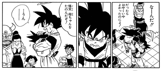 When it is time for Goku to return to the afterlife, Goten wants his father to hug him but is too shy to say so. In the end he gives in and clings to his father, showing that while he has become a powerful fighter he is still a child on the inside.
