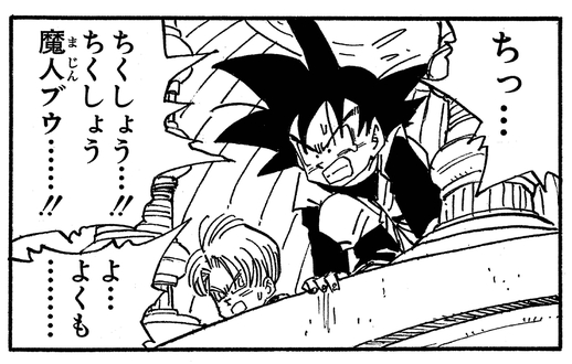 Goten's mother Chichi is turned into an egg by the evil Majin Buu, who then cruelly stomps on her, killing her in the process. Goten barely manages to suppress his rage and enters the Room of Spirit and Time with Trunks so that they can become strong enough to defeat the newly transformed Majin.
