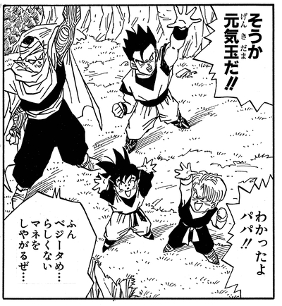 Goten even contributes to the final battle against Majin Buu by giving his energy to the Genki-dama that finally defeats the heartless villain.