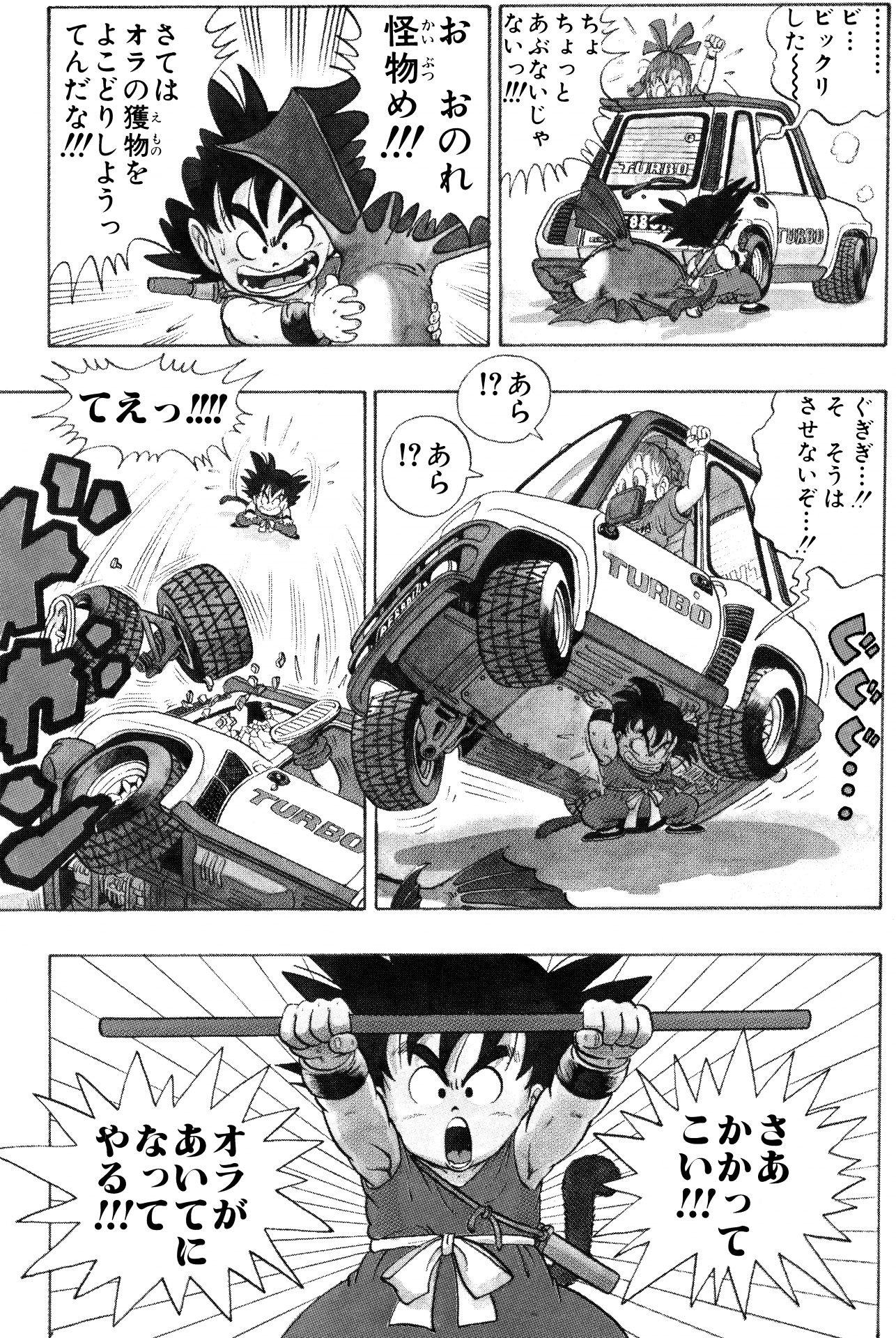 By using this mark liberally throughout, the exciting world of Dragon Ball and its characters with their boundless, buoyant energy is communicated all the more effectively to readers, sweeping them aboard the adventure. While it is true that Dragon Ball's striking and dynamic illustrations draw the eye, evocative words and symbols are also what help the story to really hit the mark!
