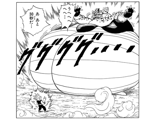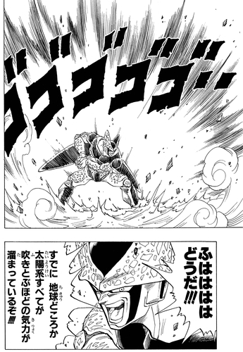 Even in his powered-down state, Cell had an ace up his sleeve: the ability to self-destruct, hoping to eradicate Gohan and the Earth along with him! However, thanks to Goku's quick thinking and Instant Teleportation, Cell was transported to the Planet of the Kaio just in time to save Earth from destruction! However, this resulted in Goku, the tiny planet, and everyone on it being blown to smithereens.