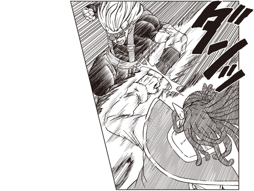 Vegeta uses his Ultra Ego transformation to take on Gas! Despite being on the receiving end of the Heeter's attacks, he takes advantage of his form's ability to use damage as fuel to change and evolve his strength and begins landing some decisive counterattacks! However, the damage eventually takes its toll and Vegeta collapses. Before Gas can deliver the final blow, Goku saves Vegeta and transforms into his black-haired Ultra Instinct form!