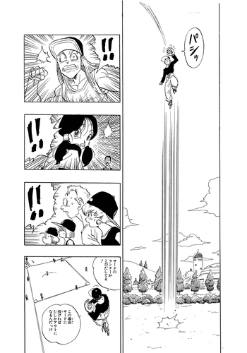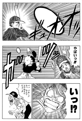 In an attempt to get revenge, Shapner intentionally throws a pitch directly at Gohan's face. When Gohan takes the full force of the pitch and suffers no injury to speak of, the once-cocky Shapner is left speechless by how physically tough this apparent "geek" really is!