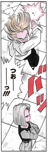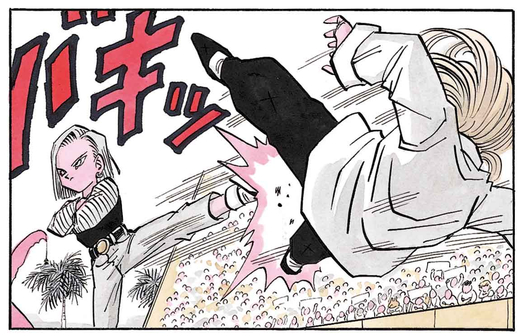 Enraged by this, Jewel gets serious and tries to quickly defeat Android 18, but a single side kick from her sends the wannabe lady killer careening out of bounds.