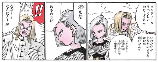 Jewel tries to sweet-talk Android 18 by starting off with what was surely meant to be an irresistible "Bonjour", but he was emotionally destroyed when she totally dismissed his advances. Perhaps talking to girls in French usually works better for him...?