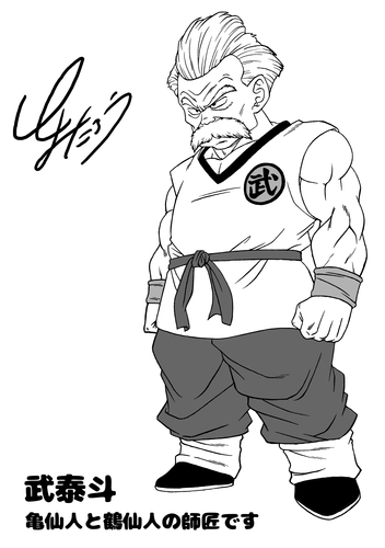 The first artwork is a two-for-one of simultaneously fresh and familiar faces: young Kamesennin and Tsurusennin! While Goku was training at Kami's Palace in the Time Room, he took a temporal trip and met both of them in the past. Young or old, both sport their signature sunglasses, and Tsurusennin dons his distinctive hat. Some things never change.