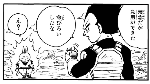 Growing flustered with all the unexpected developments, Vegeta suddenly pulls out his cell phone and announces he has some urgent business to take care of and leaves just as suddenly as he appeared! We're pretty sure he doesn't even get service in that area…
