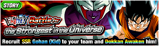 The "Fight! Battle for the Strongest in the Universe!" Story event is playable now! Include as many characters of the specified category in your team as possible to maximize the number of item drops from the boss! You can also recruit the new SSR character [Cheerful and Righteous Heart] Gohan (Kid) and then Dokkan Awaken it with the Awakening Medals available in this event!