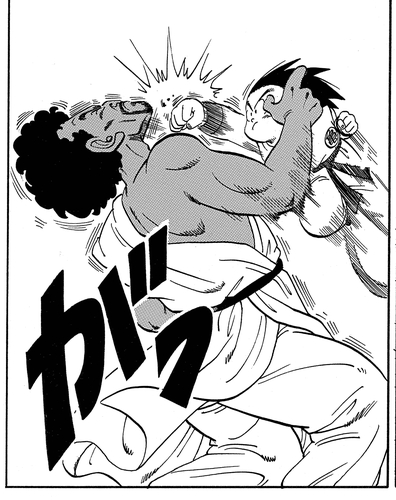 The two face off in the preliminaries and King Chappa is so confident, he tells Goku, "Open with whatever blow amuses you!" He does just that, landing a solid punch to King Chappa's jaw.