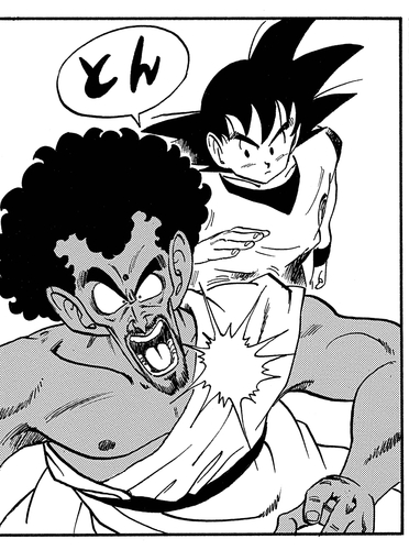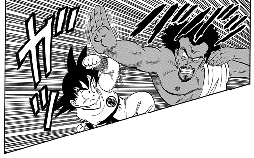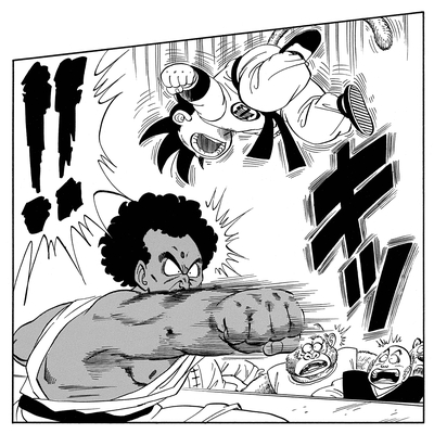 This causes the former champion to get serious, deploying his incredible Hasshu-Ken (Eight-Handed Technique)! Even that proves ineffective as Goku blocks and dodges every attack with ease before sending King Chappa to the floor with a sweep kick. When Goku seemingly makes a strategic blunder by leaping into the air and thereby limiting his mobility, King Chappa gets ready to deliver the winning blow. You can imagine the king's shock when Goku exhales so hard that he slows his descent and dodges the incoming attack. King Chappa then soon finds himself knocked out of bounds by a skillful kick launched by the young Saiyan.