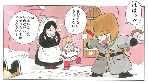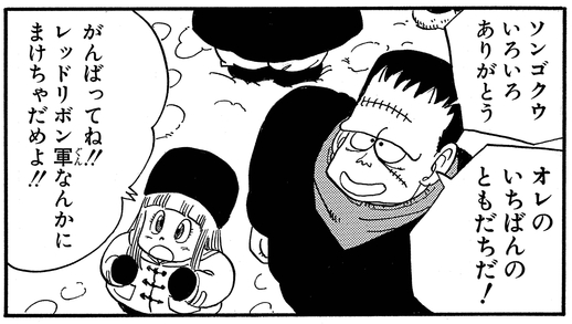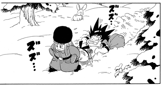 When Goku makes up his mind to take on the Red Ribbon Army at their Muscle Tower base and save the mayor, Suno lends him some warm clothes to protect him from the elements.