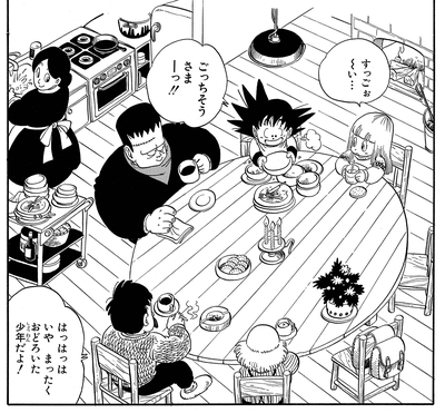 Goku succeeds in saving the mayor and even befriends the kind-hearted Android 8, and they have a feast at Suno's house to celebrate. Suno is amazed at the young Saiyan's appetite.