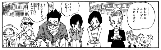 She can be seen sitting beside Bulma as one of the spectators of the 28th Tenkaichi Budokai near the end of the manga.