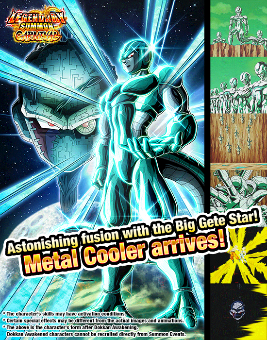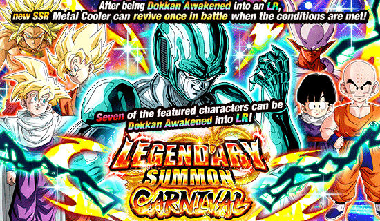 A new Legendary Summon Carnival is on now featuring an incredible seven characters who can be Dokkan Awakened to LR! Among them and making their explosive debut is a new "Carnival" summon exclusive: SSR [Grudge Rekindled] Metal Cooler!! Once Dokkan Awakened to LR, this new Metal Cooler will gain the ability to revive one time in battle when the effect's activation conditions are met! Absorb the lifeforce of your enemies and plunge them into an abyss of infinite terror!!
