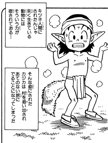 One day, he murdered a fox named Gigi, and in a final act of revenge, the spirit of the fox cursed Kajika and turned him into a being that was half-human, half-fox.