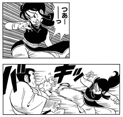 During Chichi's bout with Goku at the Tenkaichi Budokai, Kamesennin is impressed by her proficiency in combat. Perhaps owing to the influence of her father, Gyumao, who was once a student of Kamesennin's, it seems that her fighting style strongly resembles Kame School Martial Arts!