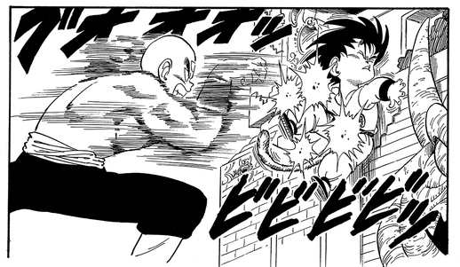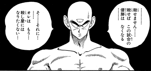 Although he used his powerful Shishin-no-Ken (Four Bodies Technique) to split himself into four copies, Goku managed to exploit the technique's weakness of each copy having only one quarter of Tenshinhan's strength and defeated him by ring-out.