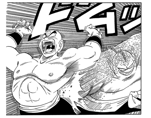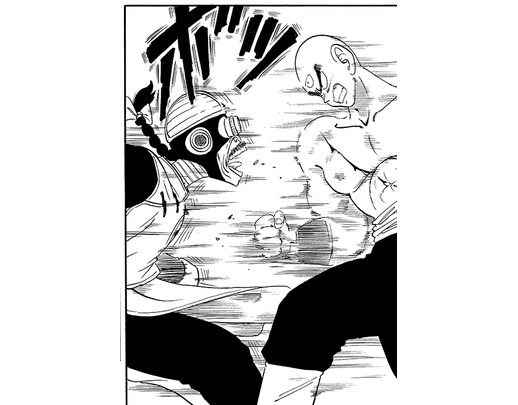 Taopaipai fired off a Super Dodonpa from a weapon that was installed in his right arm, but Tenshinhan was able to nullify it with his Kiai and knock the assassin out with an intense punch to claim victory.