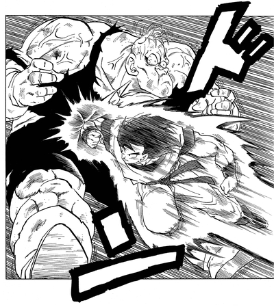 Recoome rushes towards his opponent with speed unthinkable for someone of his gargantuan stature and delivers a bone-crushing knee attack.