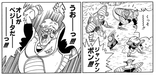 Of course, Vegeta refuses to cooperate with the Ginyu Force, and so they play rock-scissors-paper to decide who would have the honor of beating the info out of him.