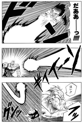 Vegeta launches a ferocious assault on Recoome, only to find the hulking elite warrior completely unphased! What's more, when the dust clears he's even taunting the Saiyan with some kind of ridiculous pose!