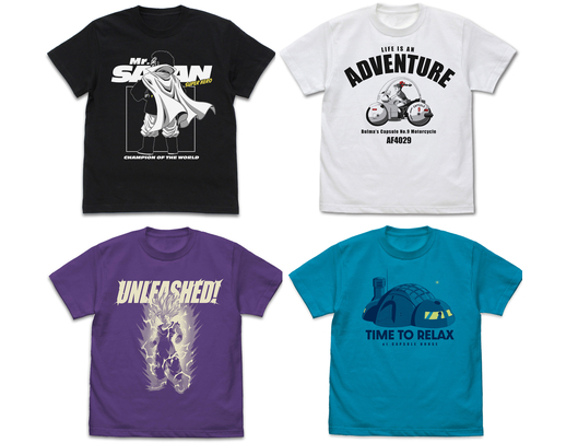 Mr. Satan looking suave as always, Gohan tearing it up in Super Saiyan mode, Bulma riding her iconic motorcycle, and the cozy Capsule House make for 4 awesome T-shirt designs!