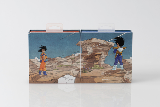 The charging case is designed to resemble the Space Pods that the Saiyans used to travel the galaxy! The Goku model earphones are designed to resemble Goku's martial arts dogi and belt while the Vegeta model features a design based on his battle armor. And the packages each feature artwork that when put together depicts the iconic scene where Goku and Vegeta get ready to square off against each other for the first time in the wastelands.