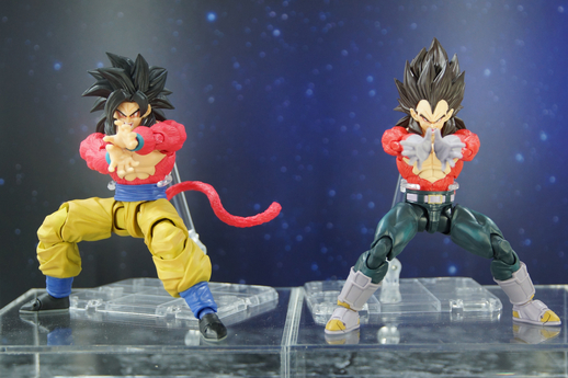 The GT section featured Super Saiyan 4 Goku and Vegeta in their Kamehameha and Galick Gun poses!! Getting these kinds of poses with the arms outstretched in front of a figure's chest was difficult with older posable figures, but Goku and Vegeta look more natural than ever here thanks to some powered up articulation around their shoulders!