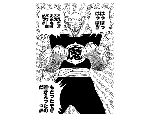This scene captures the moment Great Demon King Piccolo, having collected all 7 Dragon Balls, reclaims his former power! The demon king was able to overwhelm Goku even in his deteriorated state, and so upon seeing him power up even further, Dragon Ball fans around the world were at once struck with both despair and anticipation for the unprecedented battles to come!