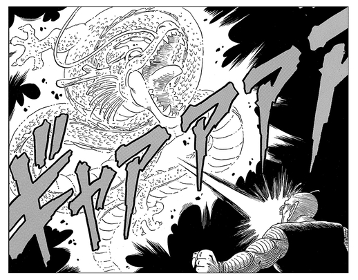 Throughout all of Jump Comics' "Dragon Ball", Great Demon King Piccolo was the only one to ever destroy Shenron. The sheer scale of Great Demon King Piccolo's ambitions is something that would frighten most ordinary folk! Not to mention the fact that his overwhelming power allows him to fulfill those ambitions! This scene perhaps expresses best that, with his former strength restored, there is no ambition too grand, no wish too farfetched such that Great Demon King Piccolo cannot fulfill it by means of his own incredible might—no divine dragon required! It comes as no surprise that this jaw-dropping scene compelled so many Earthlings to cast their vote in its favor!