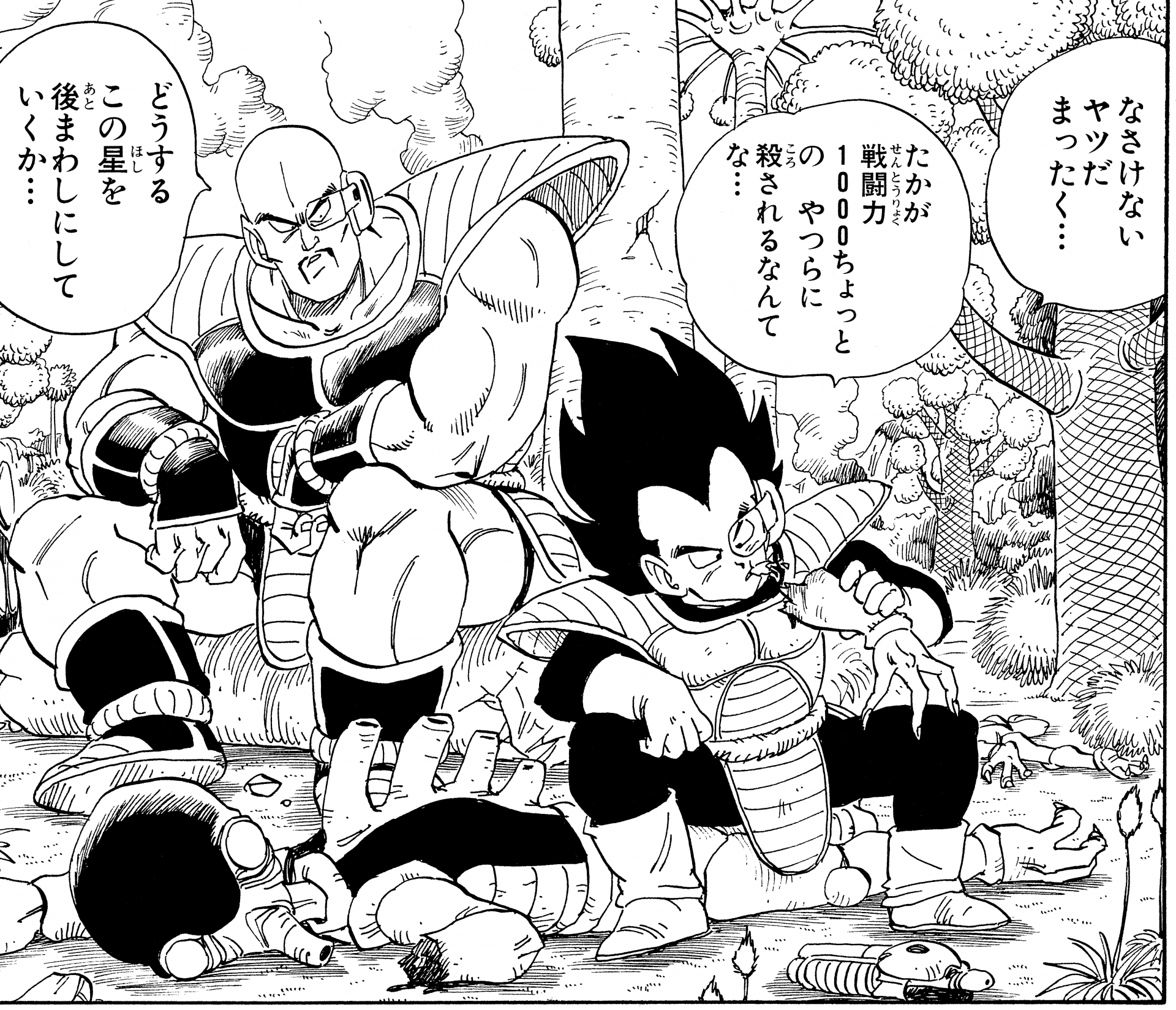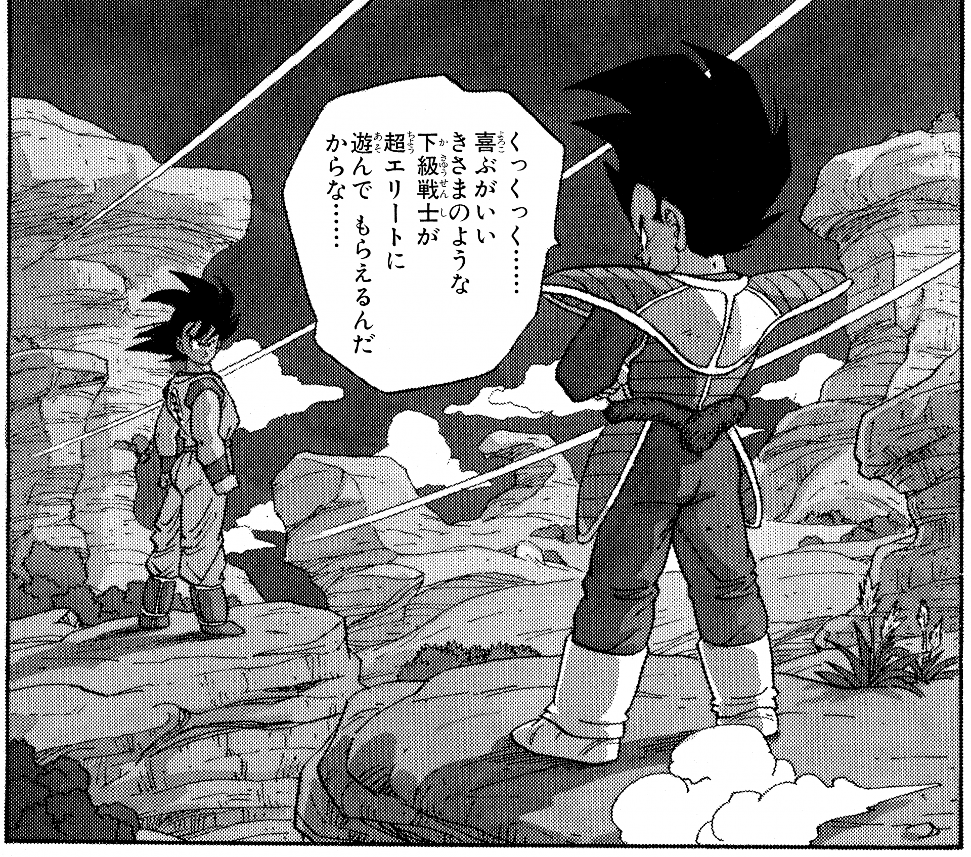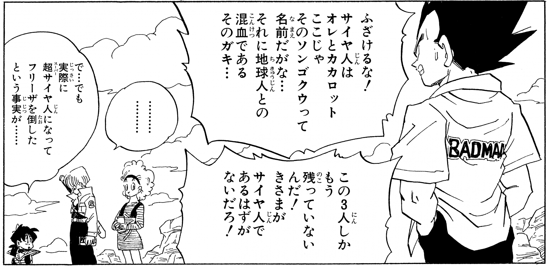 Vegeta could be seen sporting more interesting outfits after he started crashing at Capsule Corporation. These are the clothes he headed out in when Frieza and King Cold paid Earth a visit. The shirt was particularly memorable for being slightly oversized, pink, and having the word "BADMAN" written on the back. Bulma was looking fabulous too with her hair done up in a large perm at the time. Maybe there's something about living in West City that makes people want to dress to impress?