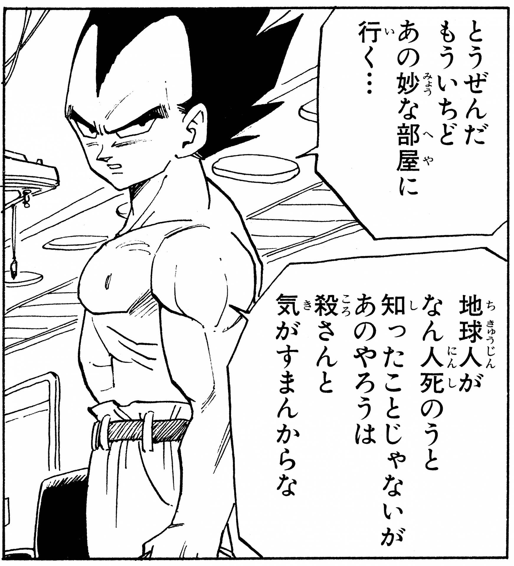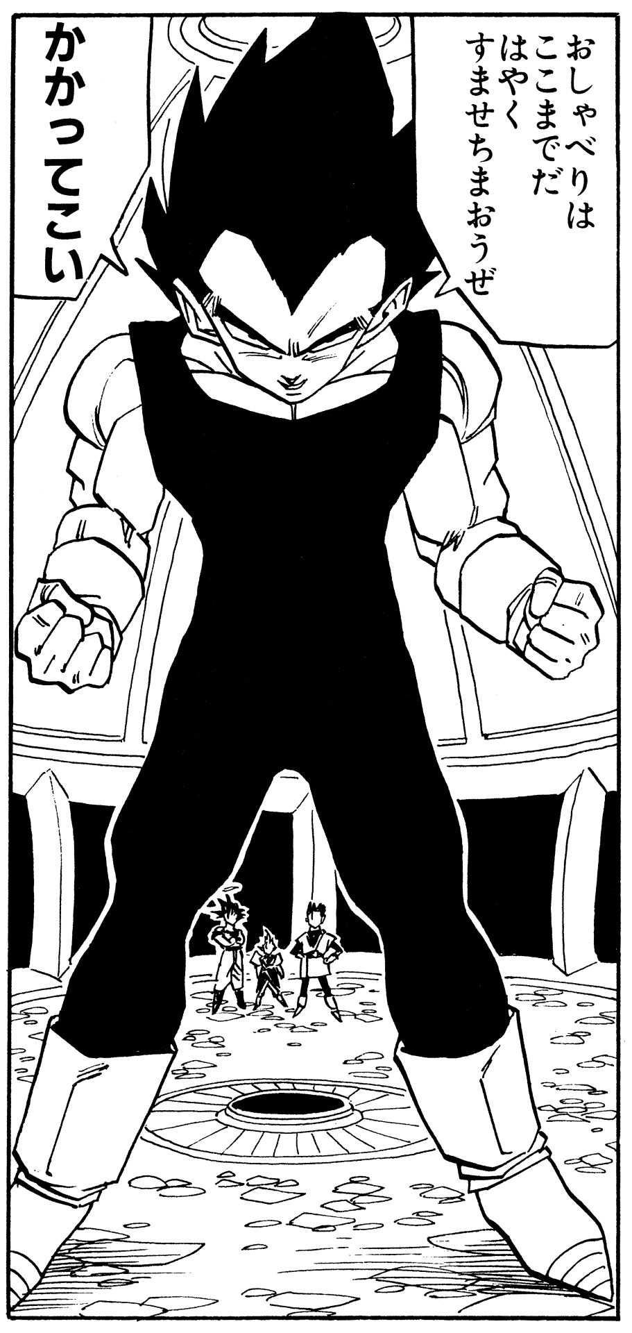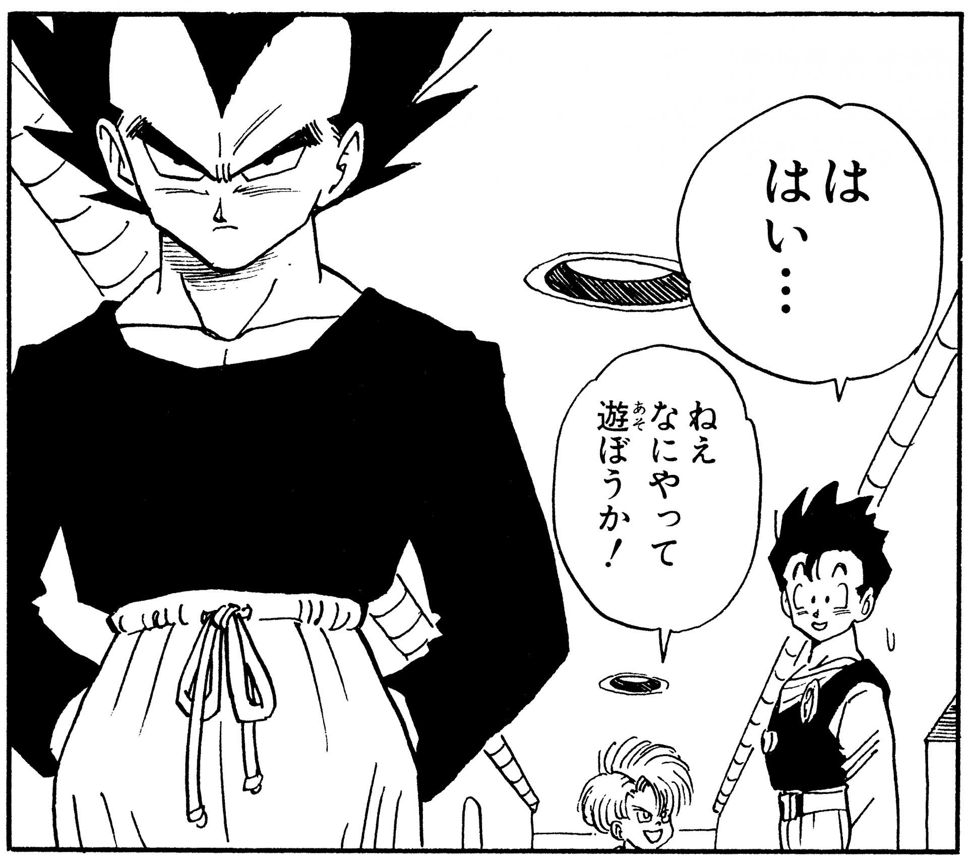 Here we have a single panel of Vegeta years after Cell was defeated looking pretty casual in his own home sporting a black T-shirt and a pair of loose-fitting pants with a drawstring around his waist.