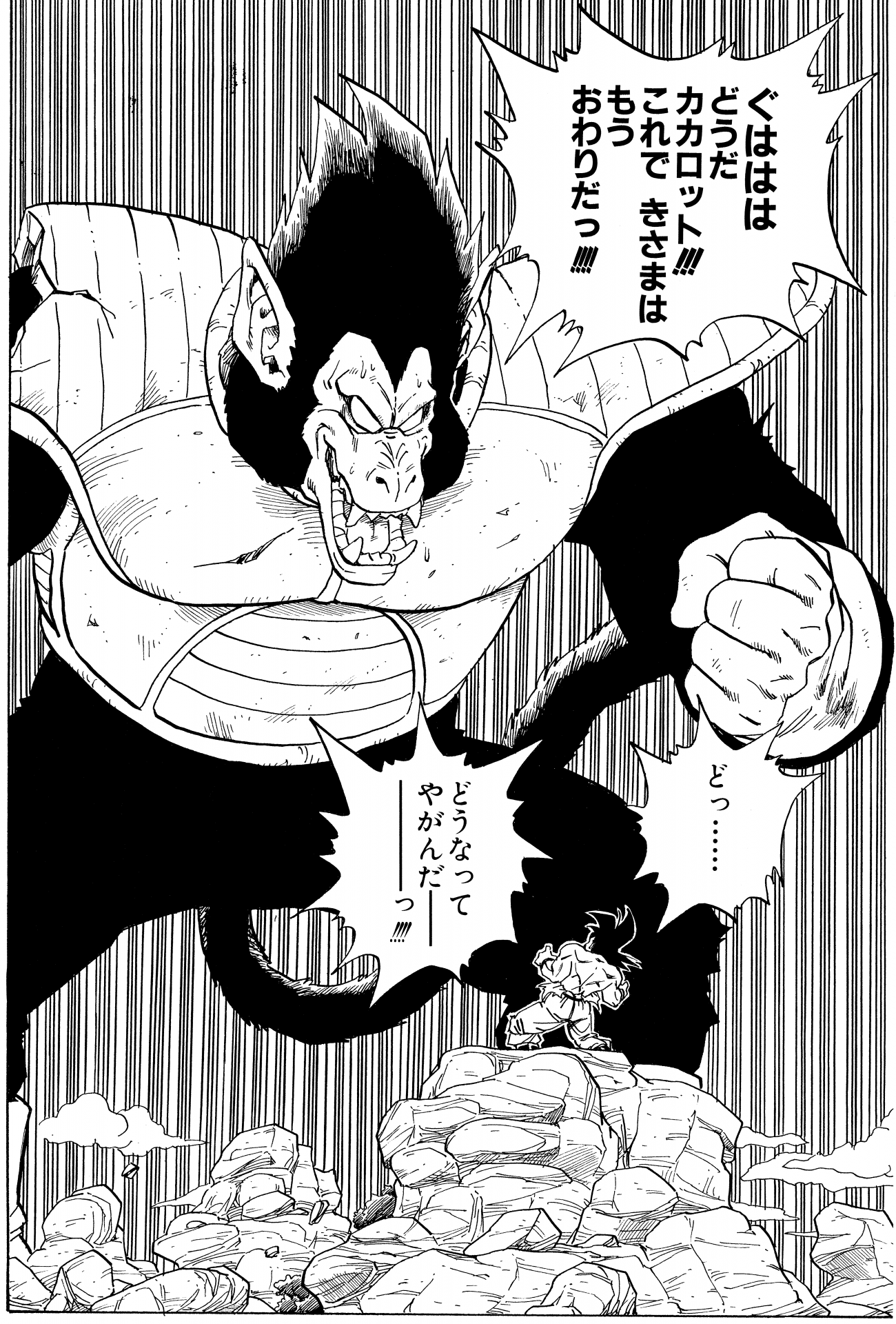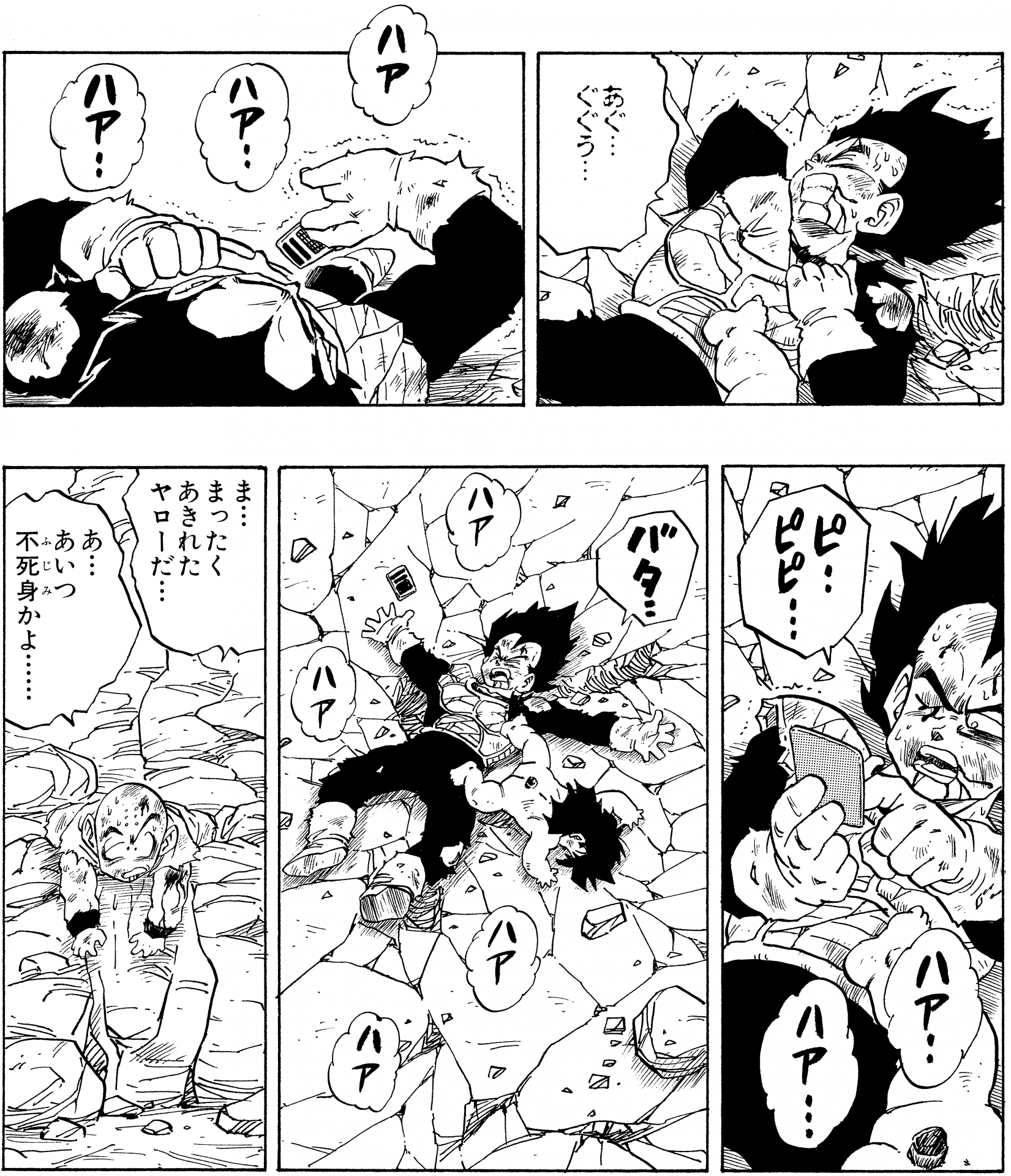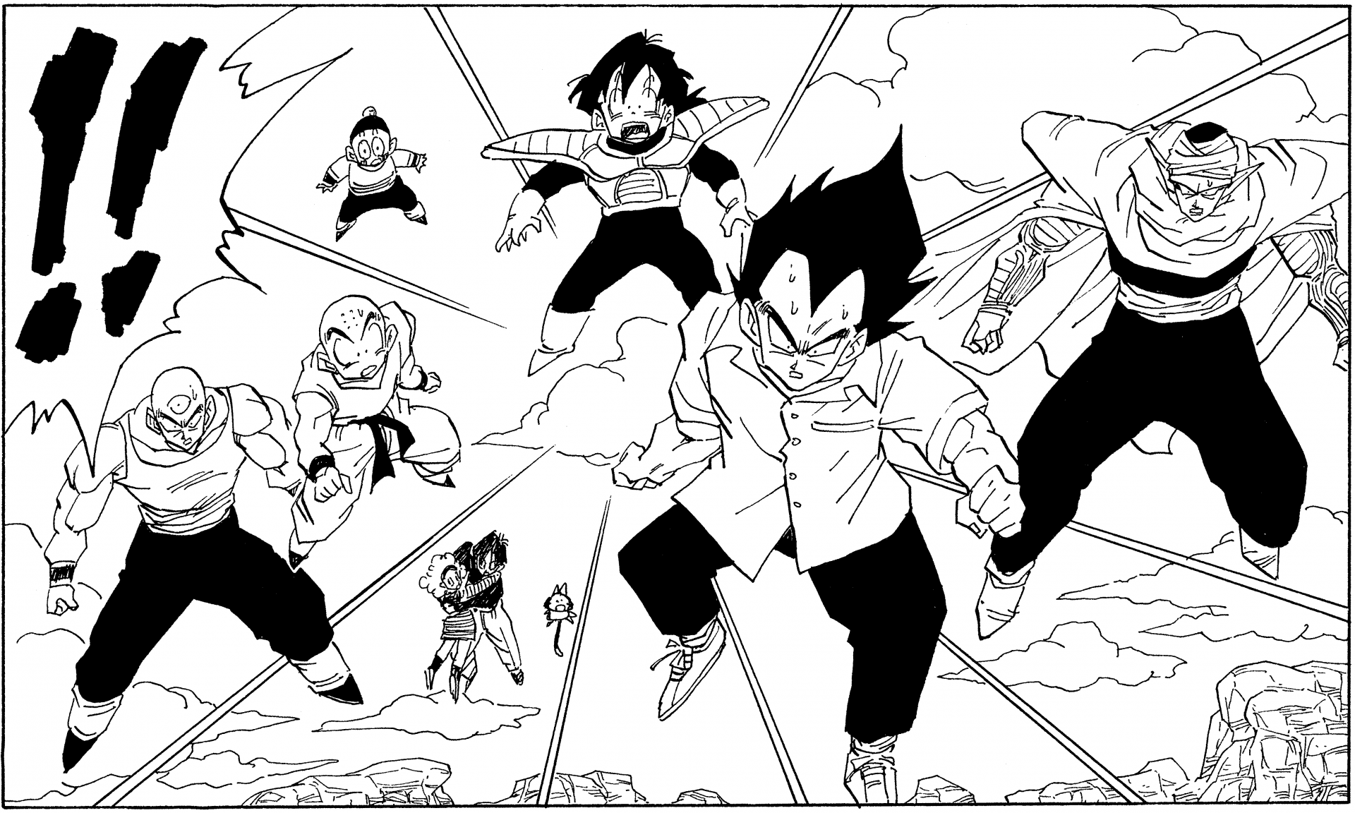 Here we have a single panel of Vegeta years after Cell was defeated looking pretty casual in his own home sporting a black T-shirt and a pair of loose-fitting pants with a drawstring around his waist.