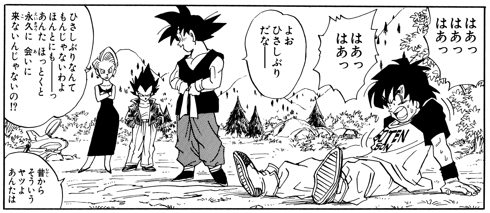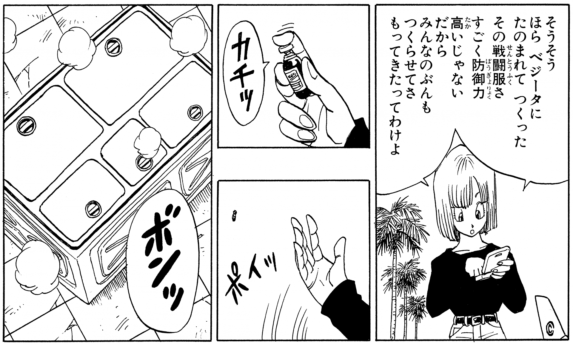 In Tale 518, Vegeta walked onto the scene looking sharp in this wild-looking jacket worn over a T-shirt along with creased pants. Standing side-by-side with his more matured wife, they make quite the power couple!