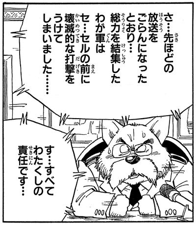 In the Android/Cell arc, the planet is once again plunged into terror, this time by the twisted ambitions of Cell. The World King deploys the Royal Defense Force and launches an all-out offensive against Cell, but his army is utterly decimated by the terrifying bio-android.