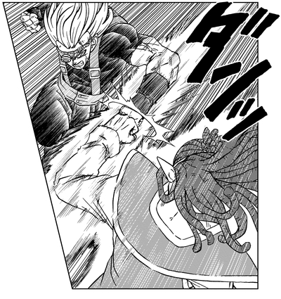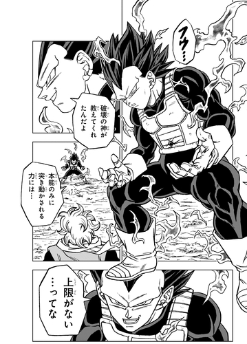 With victory etched in their minds, Goku and Vegeta stood to face Gas, who had just returned to the battlefield. First, he faced Vegeta, who continued to rise and fight back no matter how many times Gas knocked him down, further showing the evolution of his Ultra Ego transformation. Meanwhile, Goku searched inside himself and tapped into his own unique version of Ultra Instinct.