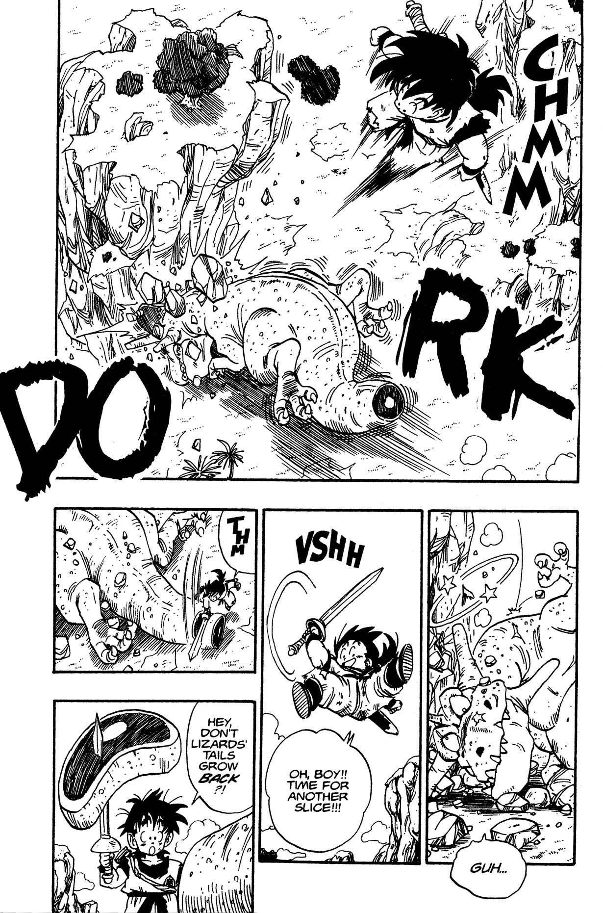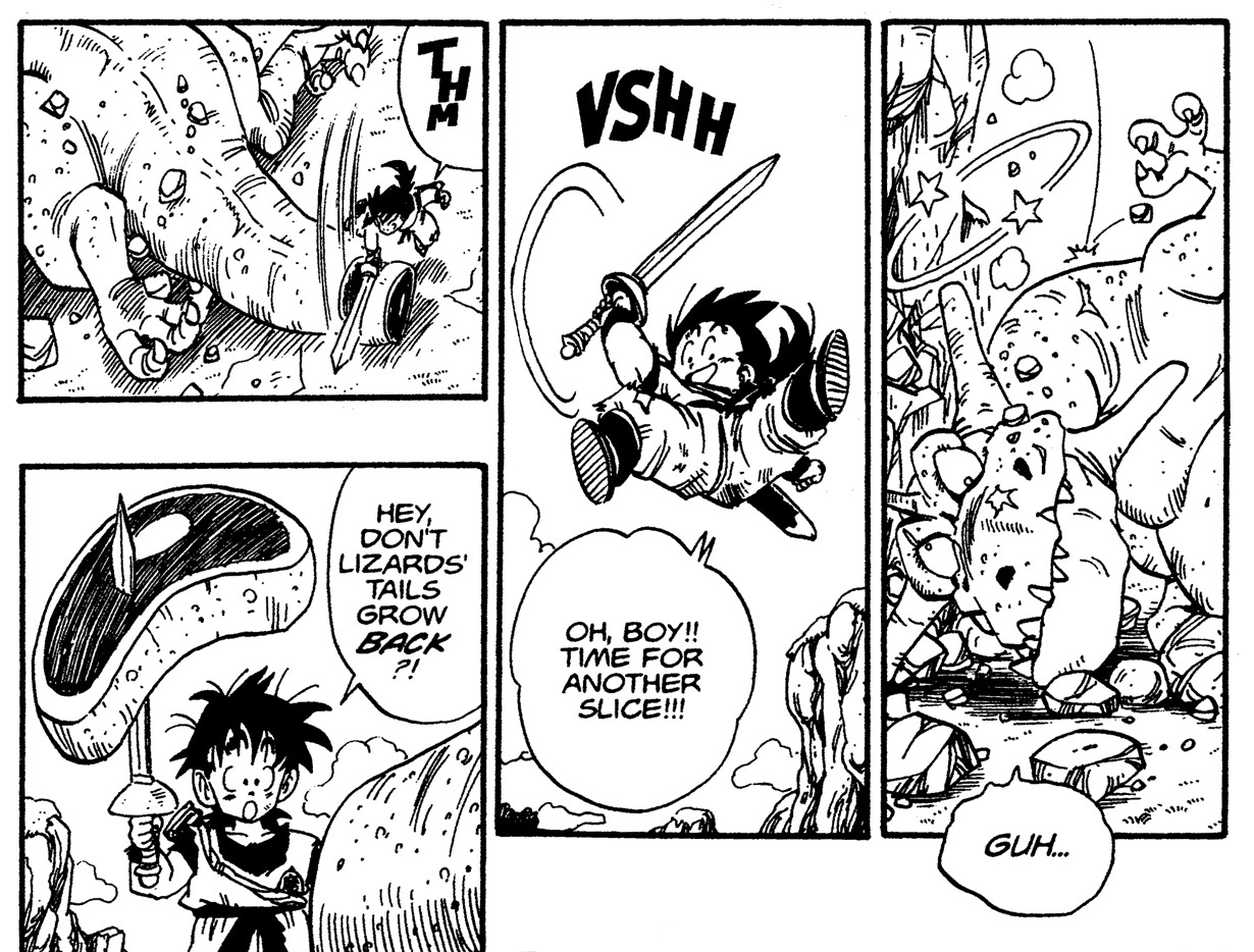 — Later on, Gohan manages to cut off a large chunk of the dinosaur's tail with his sword.