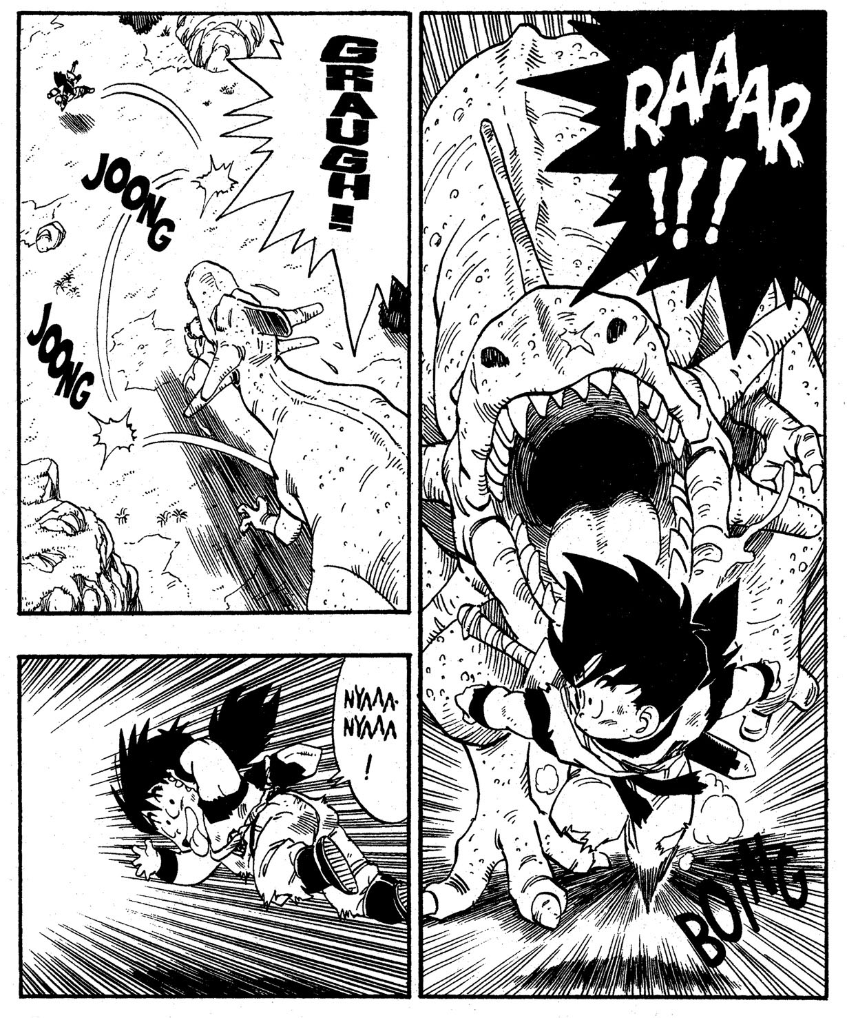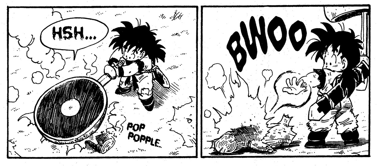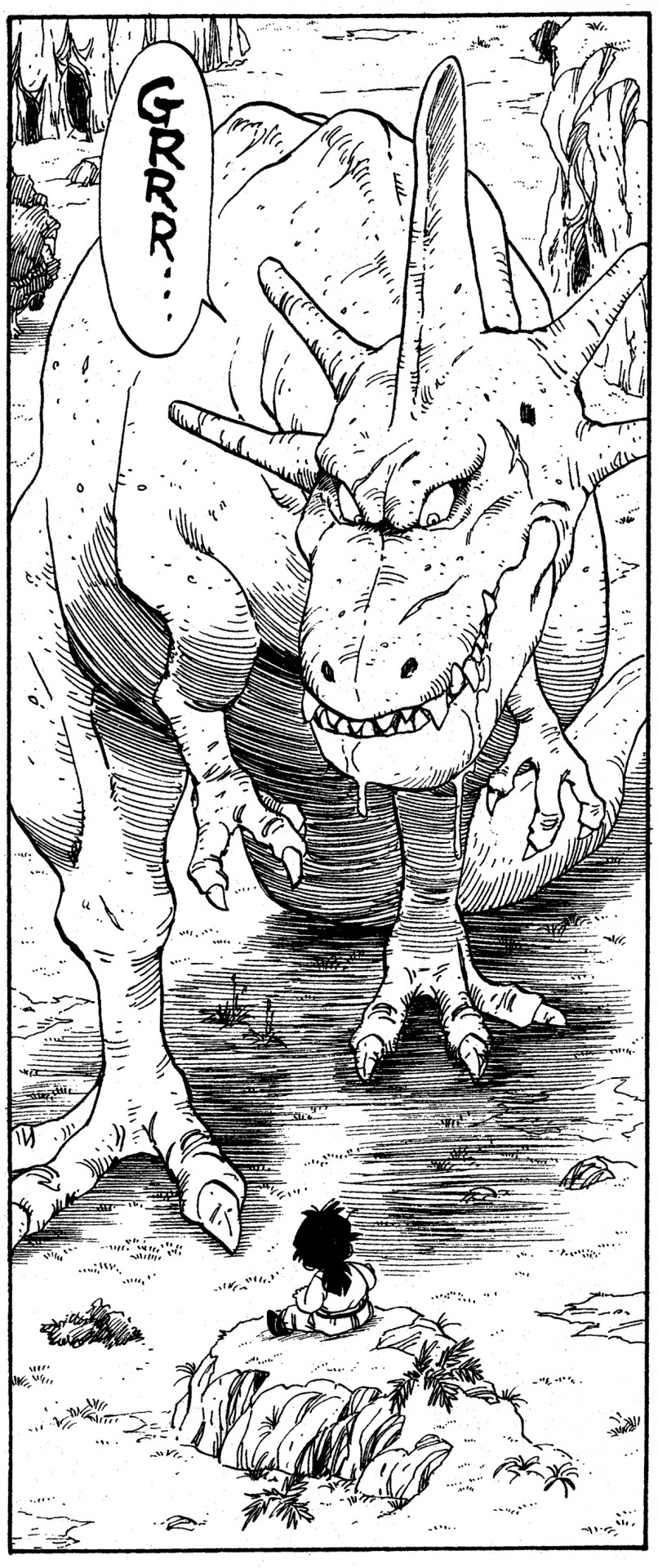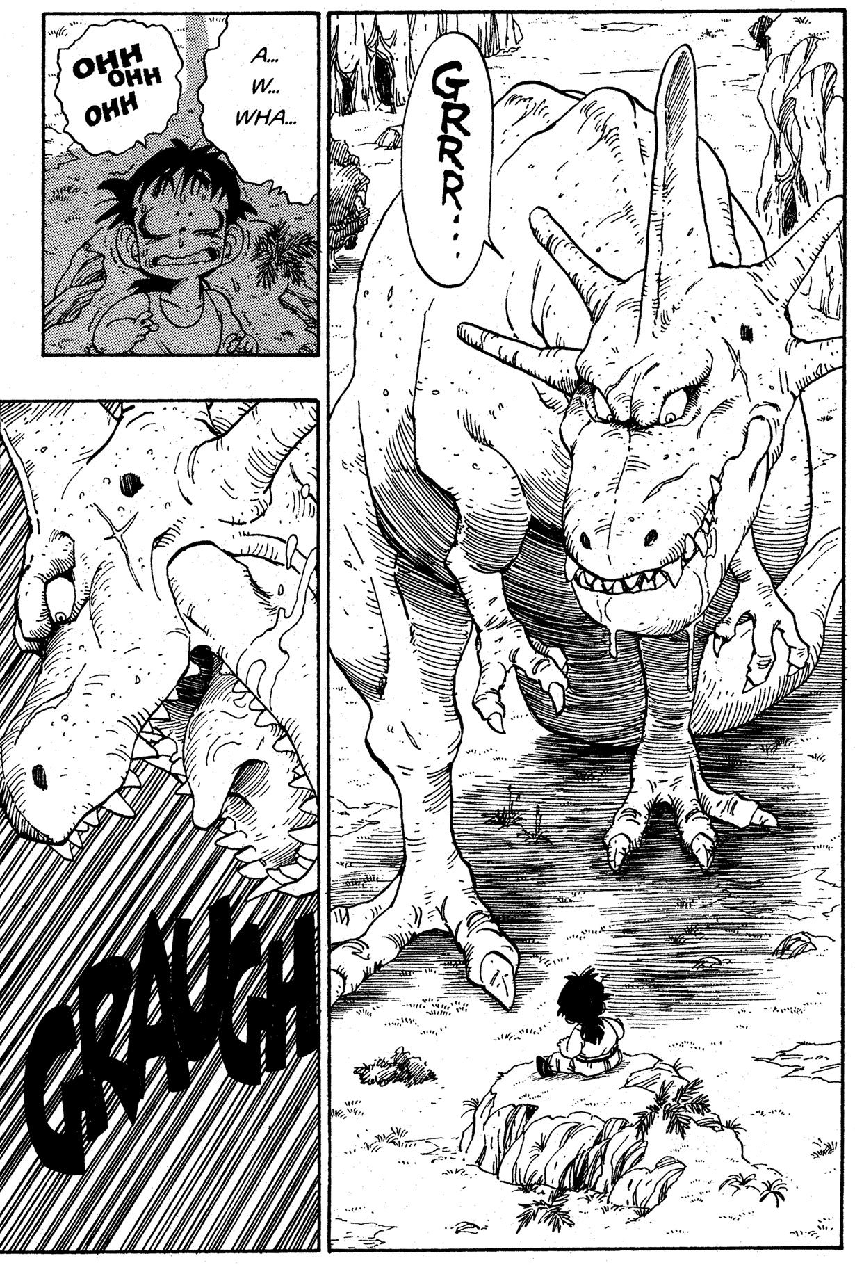 — We’ve talked a bit about dinosaur meat, so next I would like to ask you about this dinosaur's biology. Gohan is shown to be able to escape from the dinosaur by running away, but would this be possible for normal humans? Or, is Gohan just really that amazing?