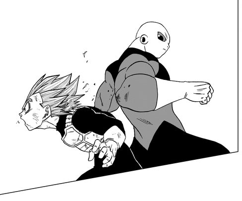 Next, Vegeta breaks past the limits of the Super Saiyan God Super Saiyan transformation and even manages to land some dazzling hits on Universe 11's defender. Jiren responds by saying that although the Saiyan prince's attacks are the best he's experienced thus far, he still has no chance at victory, before countering with a fierce strike of his own.