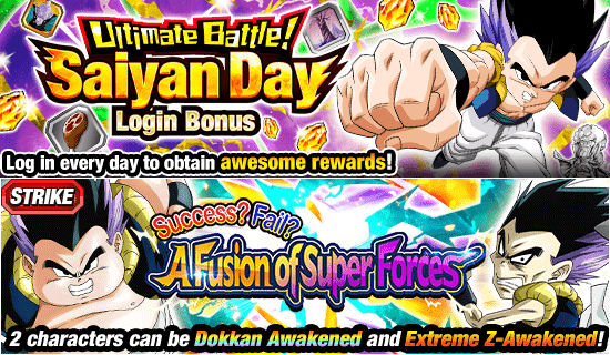 Get Dragon Stones and training items you can use to power up your characters from the login bonus and missions that are on now! Plus, make sure to log in on Saiyan Day (3/18) to get 3+1+8=12 Dragon Stones in one shot! There's also the revamped Strike Event "Success? Fail? A Fusion of Super Forces" and tons of other events to enjoy! There will also be special music playing on the home screen for a limited time to celebrate Saiyan Day! Make sure to log in and party like a true Saiyan would!