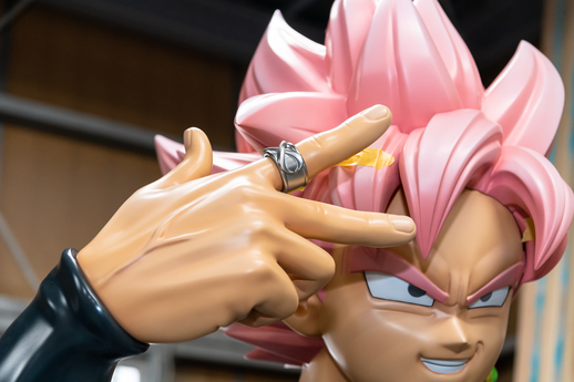 Last but not least is Goku Black, whose mold was the most challenging to create due to all the detailed parts. His Ring of Time and Potara Earring have been crafted using different materials than the statue itself. Thanks to everyone's hard work, Goku Black's flaunted godly beauty has been immaculately reproduced, as can be seen in the intricate details on the statue's face and hands.