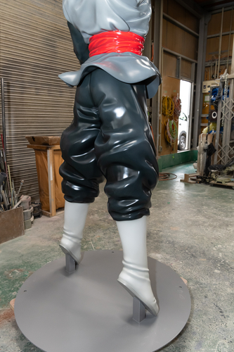 Finally, the painted statues are fitted onto metal plates that serve as their bases. The Goku Black statue's feet are supported from the base with metal framing, so when you look at it from the front, it looks like he's levitating!